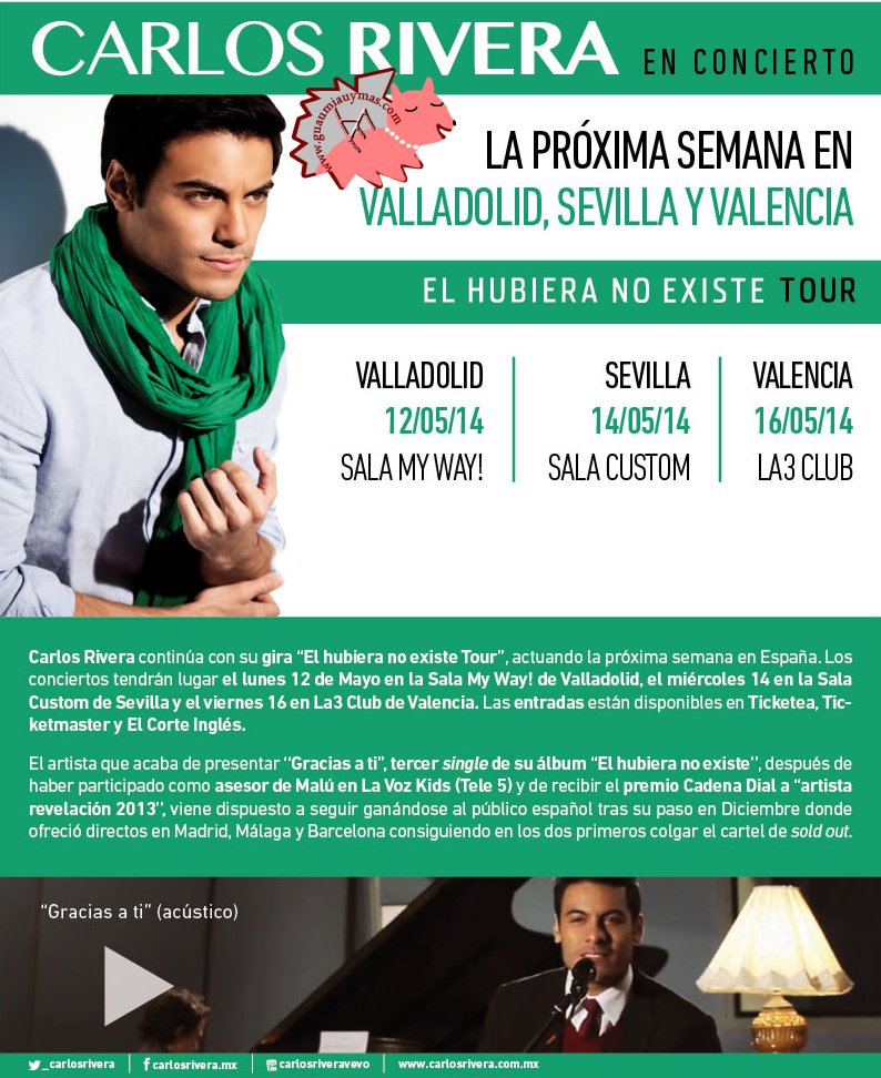 Carlos Rivera: la próxima semana llega su gira "El hubiera no existe" a España : el 12 de mayo en la Sala My Way de Valladolid , el 14 de mayo en la Sala Custom de Sevilla y el 16 de mayo en La3 Club de Valencia.
