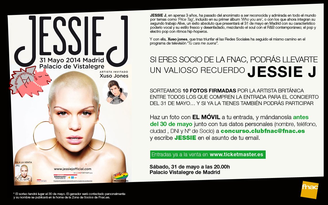 Si eres socio de FNAC y tienes tu entrada para el concierto de Jessie J en el Palacio de Vistalegre de Madrid del próximo 31 de mayo, puedes conseguir una foto firmada por ella. Aquí puedes ver toda la información .