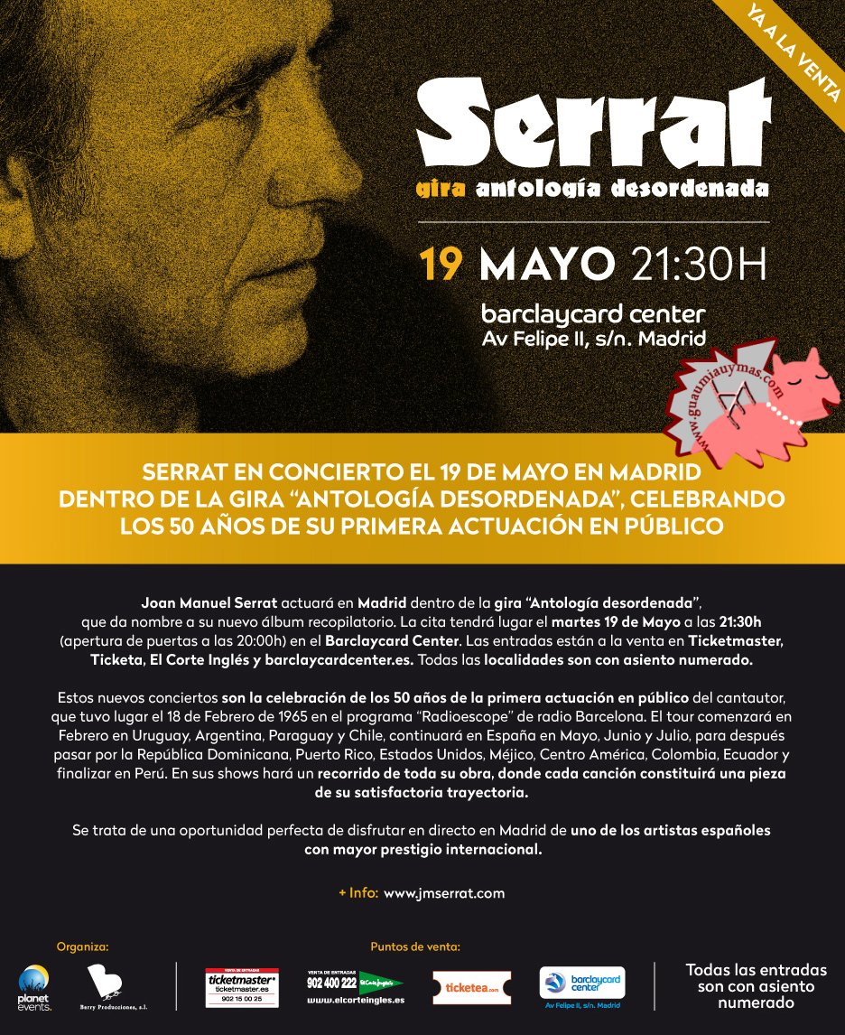 Serrat en concierto el 19 de mayo en Madrid dentro de la gira "Antología Desordenada" , celebrando los 50 años de su primera actuación en público.